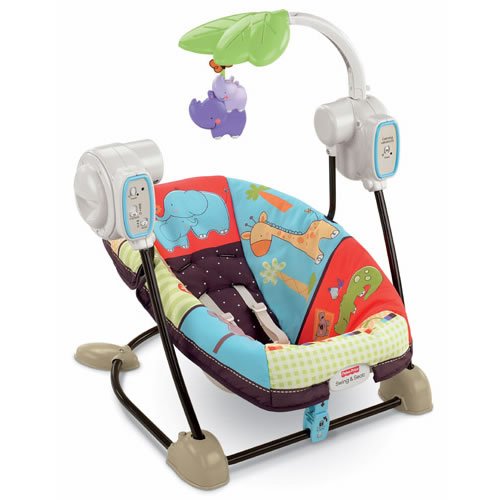 Ideal for parents with limited space, the Fisher-Price Luv U Zoo Spacesaver Swing and Seat provides a compact design to function as both an entertaining swing with songs and comfortable infant seat with vibrations. Featuring a deep seat angled just for infants and a soft seat pad with a bright, colorful zoo theme, the portable swing and seat offers a fun toy bar that removes for easy access to baby. The five-point harness and durable footings keep your baby safe and secure at all times.